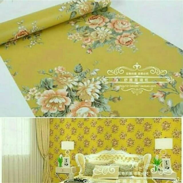 Wallpaper Dinding Motif Bunga Mawar Daun Hijau Dasar Kuning - Download